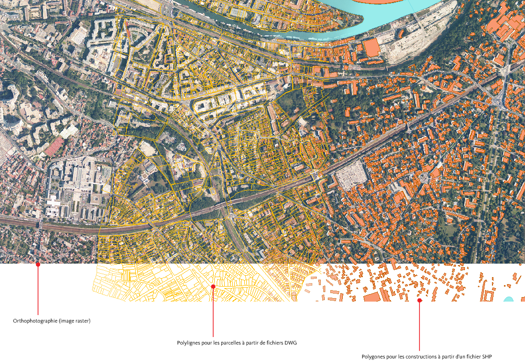 Cette carte contient une photo au format image raster, des données de construction stockées dans un fichier SHP et des données de parcelle stockées dans un fichier DWG.
