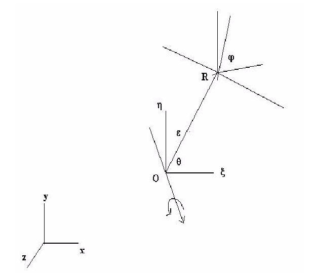 Here, we have subtracted off the non-perpendicular vector to yield the perpendicular distance between the origin of the orbiting system and the axis of the rotating system. The vector (Ux, Uy, Uz) is a unit vector that described the axis of rotation for the orbiting system.