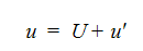 where U is the mean velocity and u' is the fluctuation about that mean. This representation is substituted into the governing equations and the equations themselves are averaged over time. Using the notation that capital letters represent the mean values and lower case letters represent fluctuating values except for temperature, the averaged governing equations can be written as: