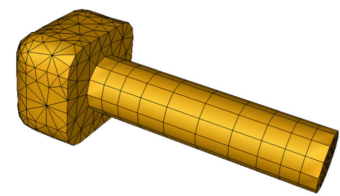 A pipe with extruded mesh contacting a tet-meshed block. The element faces on the circular end of the pipe that contacts the block are extruded down the length of the pipe.