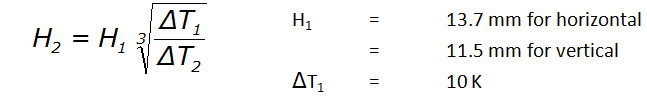 The Rayleigh number definition can be used to show that the temperature differential is proportional to the gap cubed. Using the values computed for a 10 degree differential, it is easy to compute the gap at a different temperature differential using the following: