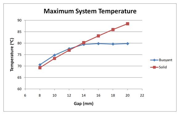To assess the accuracy of this approach, a study was performed in which the gap was varied from 8 to 20 mm, and run with both methods. Below the critical gap, the agreement between buoyancy and "solid" air is quite good. Above the critical gap, as expected, the agreement degrades due to the increased role of convection as a mode of heat transfer: