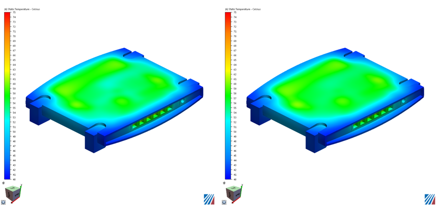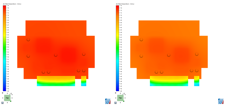 The images on the left show temperature from a flow and thermal analysis. The images on the right show temperatures from a "solid-air" analysis: