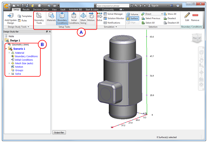 To begin, enable the Boundary Condition task from either the Setup (tab) > Setup Tasks (panel) (A) or from the Design Study bar (B):