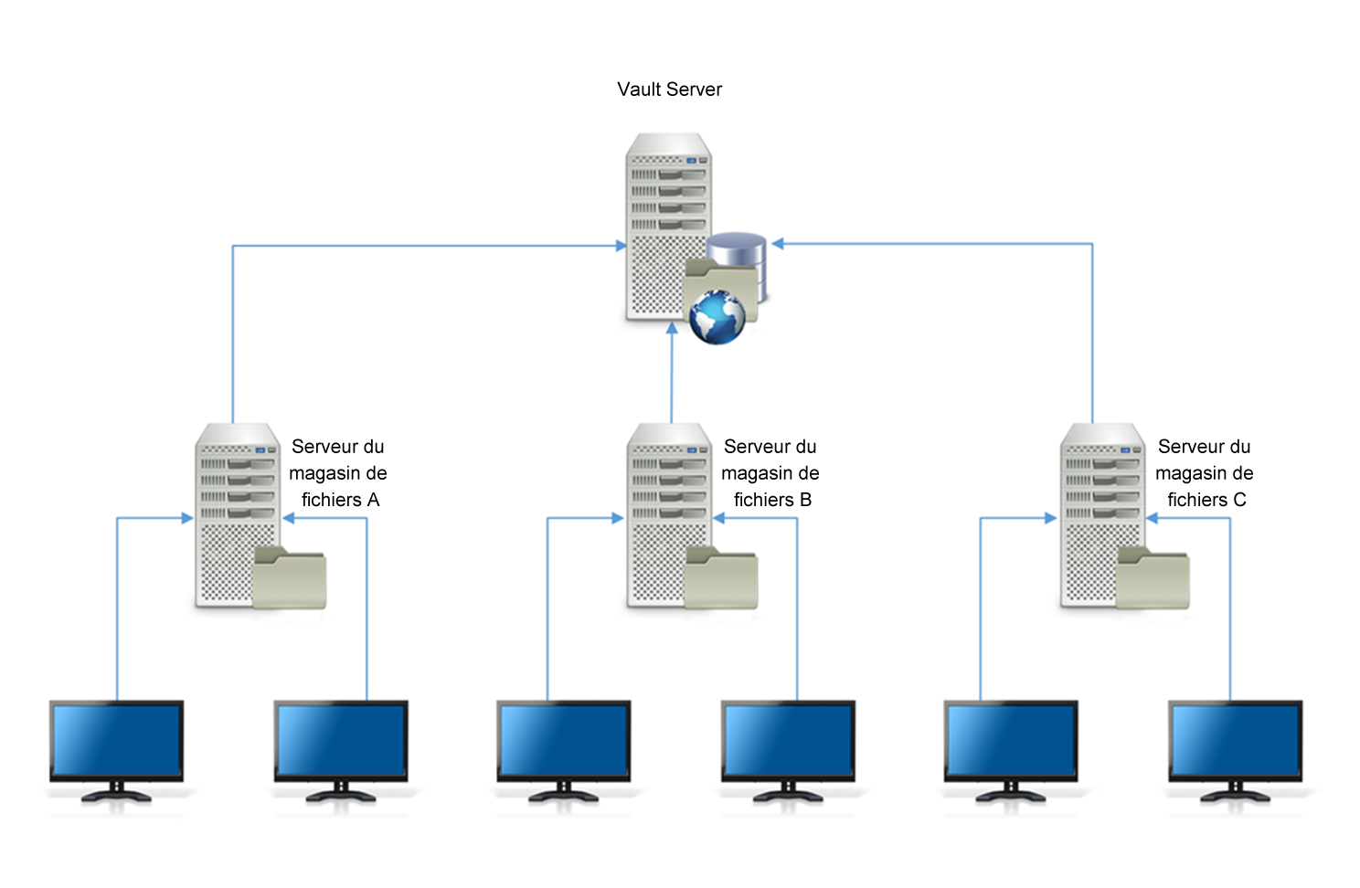 La première méthode consiste à centraliser la base de données pour l'ensemble des sites. La base de données pour Vault peut être installée sur un serveur indépendant, comme illustré ici.