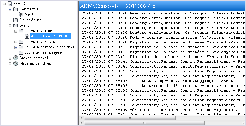 Dans la fenêtre de navigation d'ADMS Console, sélectionnez un journal dans le dossier Gestion. Une liste des journaux les plus récents pour ce groupe s'affiche.