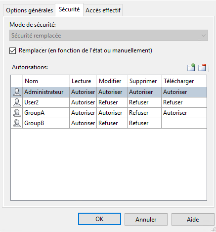 Tant qu'une liste de contrôle d'accès de remplacement existe, la sécurité basée sur l'objet est ignorée. Si l'utilisateur supprime la liste de contrôle d'accès de remplacement, la sécurité basée sur l'objet devient la nouvelle sécurité. Si une liste de contrôle d’accès de remplacement est active, seuls les membres et les utilisateurs indiqués dans la liste disposent d’autorisations pour l’objet.