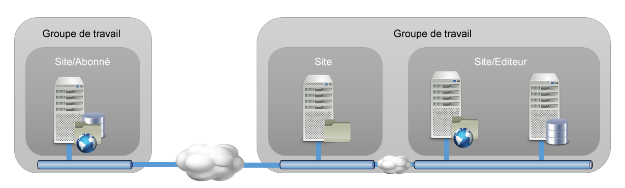 Vous pouvez répliquer les magasins de fichiers d'un site sur un autre. Ce processus est géré par une base de données Microsoft SQL. La configuration de réplication est appelée groupe de travail.
