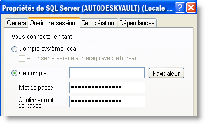 Double-cliquez sur le service SQL Server (Autodeskvault), puis sélectionnez l’onglet Connexion.