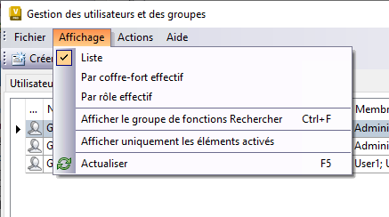 Vous pouvez afficher les groupes sous forme de liste simple répertoriant les coffres-forts effectifs auxquels les groupes ont accès, ou sous forme de liste classée par rôles effectifs.