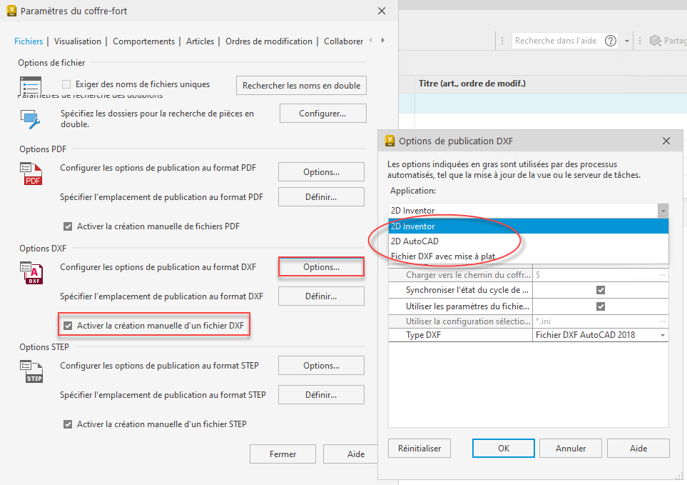 | Options de publication DXF Inventor/Options DXF avec mise à plat | |