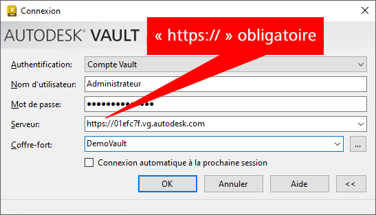 La procédure de connexion à une passerelle est la même que celle utilisée pour la connexion à un coffre-fort via une connexion directe au serveur. Le champ Serveur requiert une URL HTTPS vers la passerelle (nom d’hôte d’une passerelle, affiché lorsqu’un administrateur gère une passerelle) au lieu d’un nom de serveur. Vault Client ne peut pas se connecter à la passerelle si l’URL ne contient pas https://.