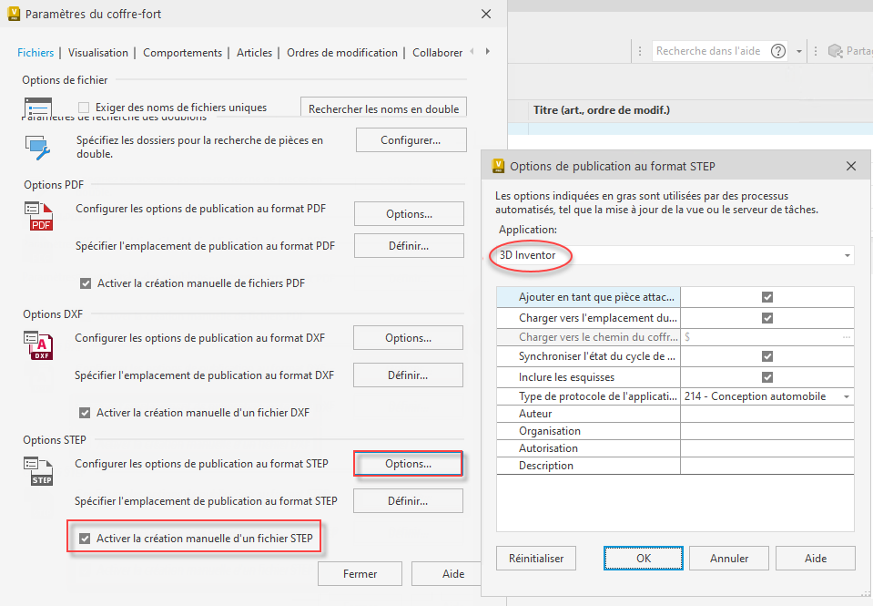 | Options de publication au format STEP pour Inventor |