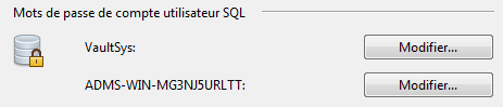Lorsque Vault est installé, des mots de passe par défaut sont fournis pour les comptes de service de SQL VaultSys et ADMS_%nomdusite%. L’administrateur peut modifier ces mots de passe afin qu’ils soient davantage sécurisés.