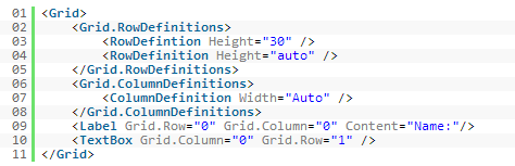 Il s’agit de la structure de base d’une grille. Une grille doit comporter des lignes, qui sont définies dans la section Grid.RowDefinition. Une hauteur de 30 indique une valeur fixe qui ne peut plus être modifiée par la suite. La valeur "auto" génère dynamiquement la hauteur de la ligne en fonction des contrôles qu'elle contient. Les mêmes valeurs s'appliquent à la largeur de la colonne.