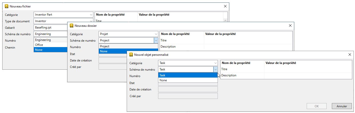 Une fois les exercices terminés, la numérotation des nouveaux fichiers, projets ou tâches suit les règles de filtrage des schémas de numérotation selon le contexte requis, comme indiqué dans les images pour les projets, tâches et fichiers dans Vault Explorer.