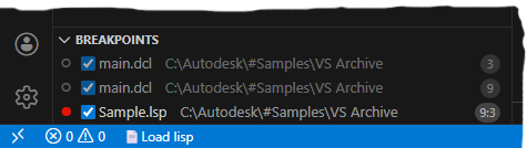- Click Start Debugging or press F5 to load and debug the AutoLISP source code in the active window.