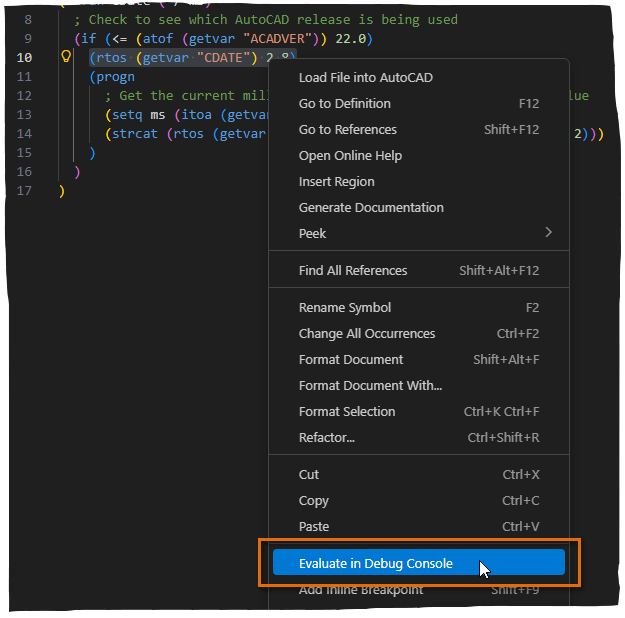To Evaluate Selected Expressions while Debugging an LSP File (AutoLISP/VS Code)