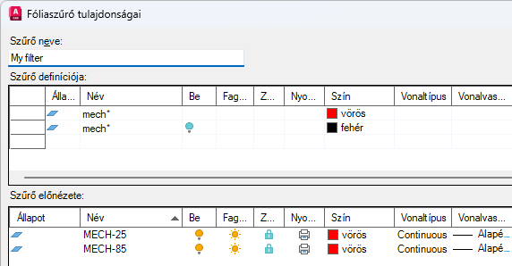 Ebben a példában a fóliatulajdonság-szűrő olyan fóliákat tartalmaz, amelyek a „mech” kifejezéssel kezdődnek és vörösek, vagy olyan fóliákat, amelyek a „mech” kifejezéssel kezdődnek, ki vannak kapcsolva és fehérek.