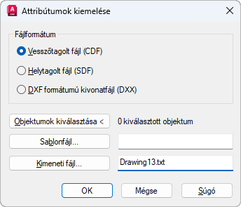A kiemelt attribútumadat fájlnevét és helyét határozza meg. Adja meg a kiemelt attribútumadatok számára az útvonalat és fájlnevet, vagy kattintson a Kimeneti fájl gombra, ha meglévő sablonfájlokat szeretne keresni egy szokásos fájlkiválasztó párbeszédpanel segítségével. A program aCDF- és az SDF-fájloknak .txt kiterjesztést, a DXF-fájloknak .dxx kiterjesztést ad.