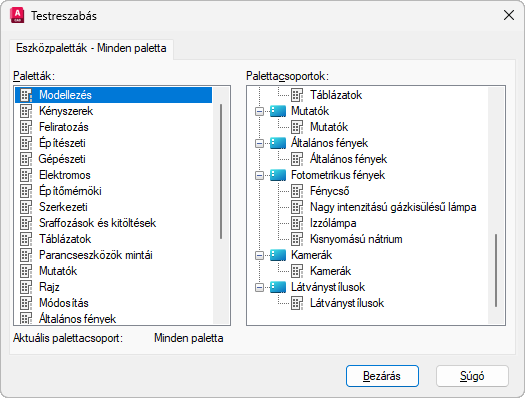 Megjeleníti az eszközpaletta-csoportok és az azokban található eszközpaletták fanézetét.