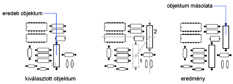Lehetősége van arra is, hogy objektumokat kijelöljön, majd a bal egérgombbal az egyik kijelölt objektumra kattintva máshova húzza őket. Másolat készítéséhez nyomja le a Ctrl billentyűt. Ezzel a módszerrel objektumok áthúzhatók más megnyitott rajzokba vagy akár más alkalmazásokba.
