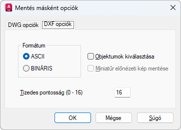 Megadja, hogy a program ASCII vagy bináris DXF-fájlt hozzon-e létre. Az ASCII formátumú DXF-fájlok szövegszerkesztővel olvashatók, és az alkalmazások széles körével kompatibilisek. A bináris formátumú DXF-fájlok kisebb méretűek. A bináris formátumú fájlok esetében az olvasási és írási műveletei gyorsabbak, mint az ASCII-formátumú fájlok esetében.