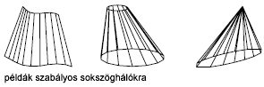 A szabályos háló egy 2 x N méretű poligonhálóként kerül létrehozásra. A SZABFEL a háló csomópontjainak felét a definíciós görbén, a másik felét pedig a másik görbén helyezi el egyenlő közönként. A töréspontok számát a SURFTAB1 rendszerváltozó határozza meg. Értéke a két görbén azonos, így a két görbe mentén lévő töréspontok közti távolság a görbe hosszának függvényében különböző lehet.
