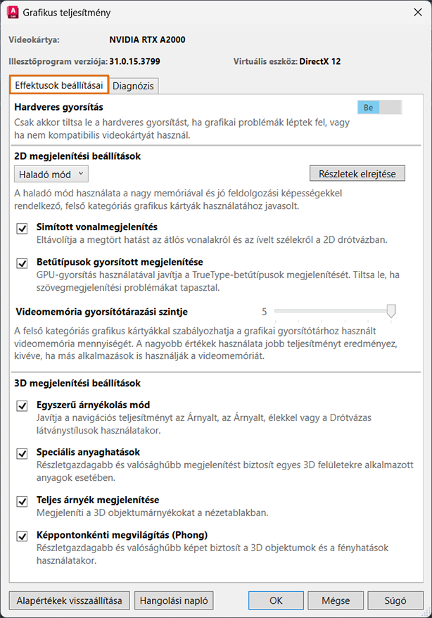 Megjeleníti a hardveres gyorsítás beállításait, valamit a 2D és 3D megjelenítési beállításokat.