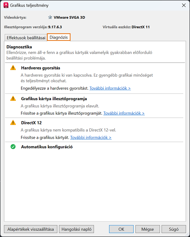 Ez a párbeszédpanel a hardveres gyorsítást szabályozza, módosítja a 2D és 3D megjelenítési beállításokat, valamint diagnosztizálja a grafikus kártyák gyakran előforduló konfigurációs problémáit.