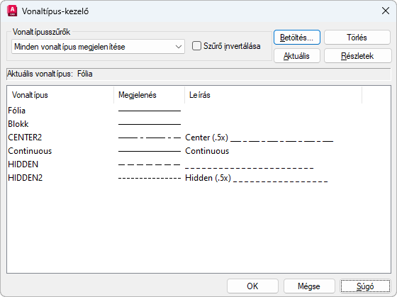 Megjeleníti a betöltött vonaltípusokat a Vonaltípus szűrőben meghatározott opciónak megfelelően. Az összes vonaltípus gyors kiválasztásához vagy törléséhez kattintson a jobb gombbal a vonaltípus listára a helyi menü megjelenítéséhez.