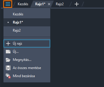 A fájllap menüjében többek között megtekintheti a megnyitott rajzok listáját, válthat a rajzok között, vagy mentheti és bezárhatja az összes rajzot.