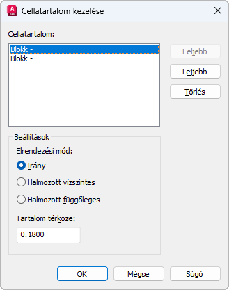 Megjelenésük sorrendjében felsorolja a kiválasztott cellában lévő összes szöveget és/vagy blokkot. A szöveget Táblázatcella szövege címke jelzi. A blokkot a blokk nevét megelőző Blokk szó jelzi.