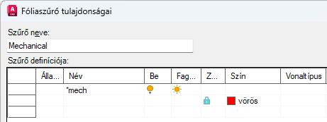 A szűrő neve Gépészeti, és a szűrődefiníció a következő feltételeket tartalmazza: