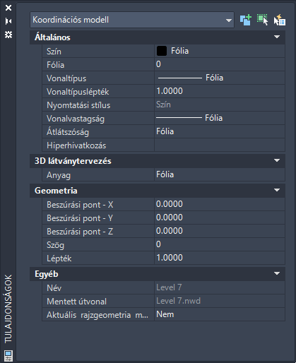 A Tulajdonságok paletta megjelenítéséhez kattintson duplán a koordinációs modellre vagy a modell körüli befoglaló téglatestre.