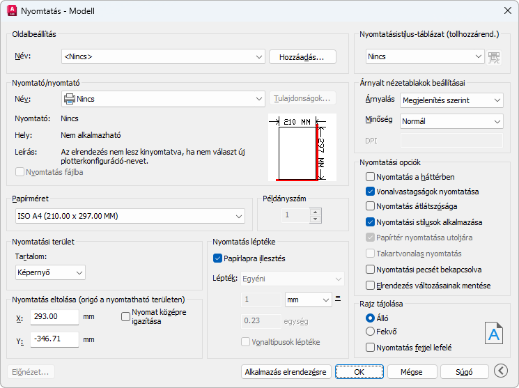A vonalvastagság, átlátszóság, nyomtatási stílus, árnyalt nyomatok és az objektumok nyomtatási sorrendjének beállításait határozza meg.