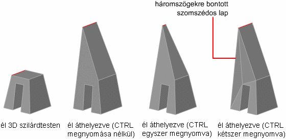 • Él mozgatása. Ha élt mozgat, forgat vagy léptékez, és az áthúzás közben egyszer lenyomja, majd felengedi a Ctrl billentyűt, akkor az él a csúcspontjai nélkül módosul. A szomszédos lapok felülete érintetlen marad, de a módosított él hossza változhat.