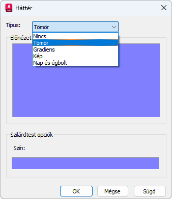 Felsorolja a nézetre alkalmazható háttér-felülírásokat (Nincs, Szilárdtest, Gradiens, Kép, Nap és égbolt).