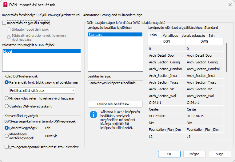 Az alapértelmezett leképezési beállítás a Standard, amely adatokat emel ki az éppen exportált rajzból, és a leképezési előnézetben látható módon automatikusan leképezi a DGN-fóliákat, a -vonalvastagságokat és a -színeket.