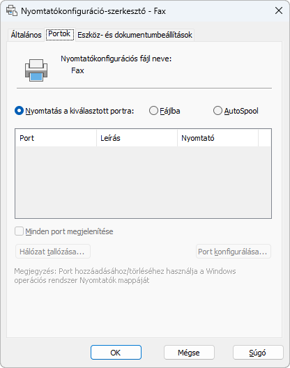 A rendelkezésre álló helyi és hálózati portok listáját jeleníti meg. Ha a port egy hálózati port, a hálózati nyomtató neve is megjelenik.