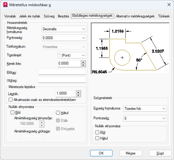 Az elsődleges mértékegységek formátumának és pontosságának beállítása, illetve elő- és utótagok hozzáadása a méretszövegekhez.