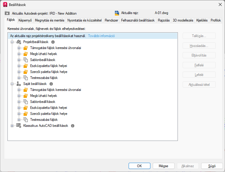 A csatlakoztatott támogatási fájlok útvonalának módosításával kapcsolatos információkért lásd: Autodesk-projekthez csatlakoztatott támogatási fájlok útvonalának beállítása.