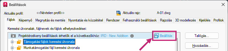 Megjegyzés: Ha nem látja a Beállítás lehetőséget, előfordulhat, hogy a projekt korábban már konfigurálva lett. Ezt „Az aktuális rajz projektérzékeny beállításokat használ” szöveg megjelenése igazolja.