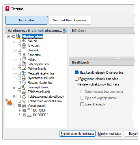 Ha nem az összes vonaltípust kell tisztítani, bontsa ki a Vonaltípusok fa nézetet. Ezután válassza ki a tisztítandó vonaltípus-definíciókat.