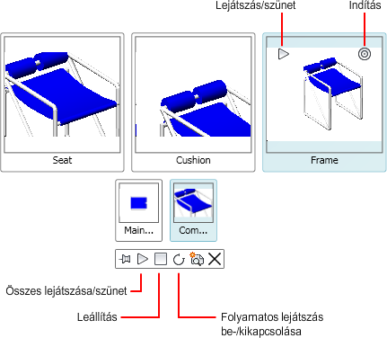 A felvétel létrehozása után az egyes felvételek vagy felvételsorozatok miniatűrjein, illetve a ShowMotion vezérlőelemein található, megjelenítésre szolgáló kezelőszervek segítségével visszajátszhatja a felvételhez rendelt animációt. A megjelenítésre szolgáló kezelőszervek a következők: