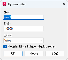 Az új paraméter típusát határozza meg. A választható paramétertípusok: valós, távolság, terület, térfogat, szög, karakterlánc.