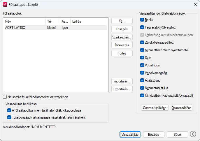 A kiválasztott fóliaállapotot a fóliatulajdonságok felülírásaként alkalmazza a program az aktuális elrendezési nézetablakra. Ez az opció akkor érhető el, ha aktuális elrendezés nézetablak esetén indítja el a Fóliaállapot-kezelőt.