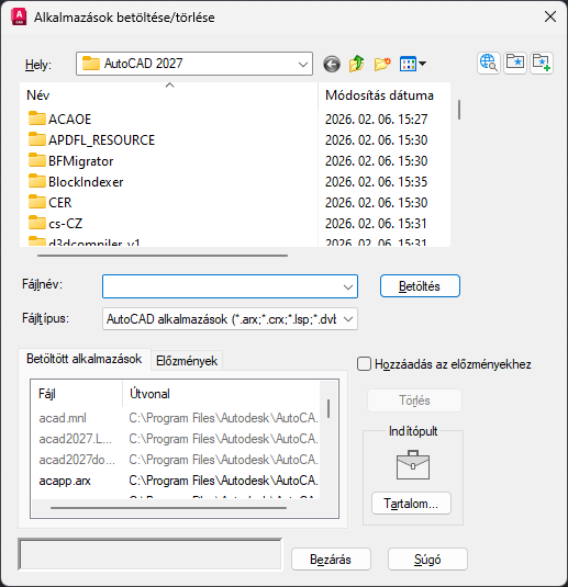Ha korábban már betöltött fájlt jelöl ki, a Betöltés újra betölti az alkalmazást, ha ez lehetséges. ObjectARX-alkalmazások nem tölthetők be ismételten. Ilyenkor először el kell távolítania az ObjectARX-alkalmazást, majd újra be kell töltenie. A Betöltés opció helyi menüből is elérhető, ha a jobb gombbal egy fájlra kattint az Előzmények lapon.