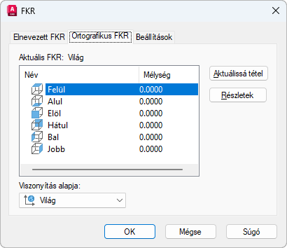 Felsorolja az aktuális rajzban definiált hat ortografikus koordináta-rendszert. Az ortografikus koordináta-rendszereket a Viszonyítás alapja listában meghatározott FKR-hez viszonyítva adja meg.