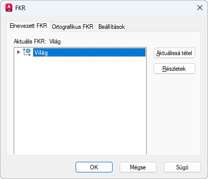 Felsorolja az aktuális rajzban definiált FKR-eket. Egy mutató jelzi az aktuális FKR-t.